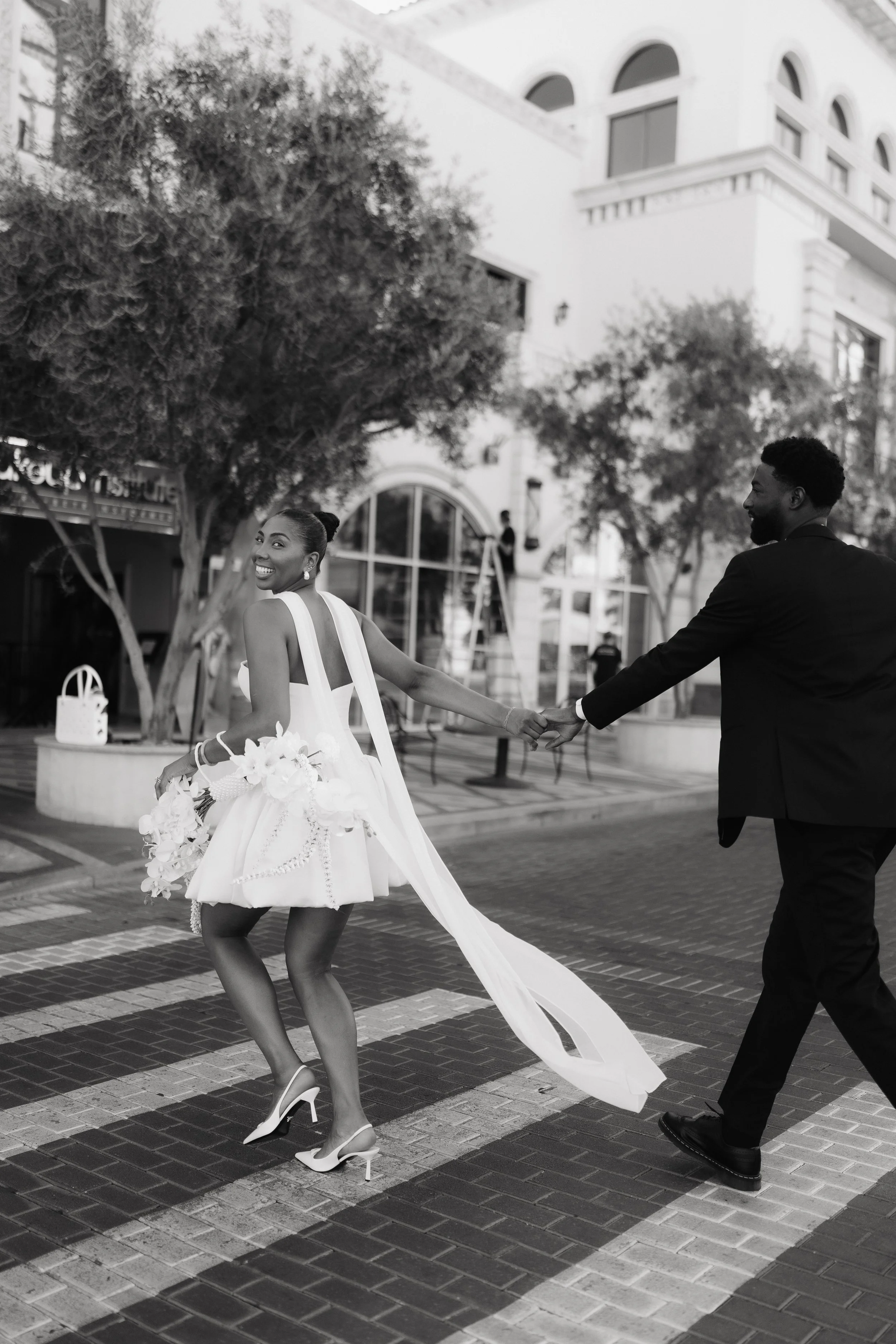 Afterward, they wandered through Tivoli Village, soaking in the soft glow of the evening and stealing a few just-married moments beneath its European-inspired charm. The night ended the best way — gathered around a table with slices from Pizza, laughing, reminiscing, and savoring the first hours of forever together.